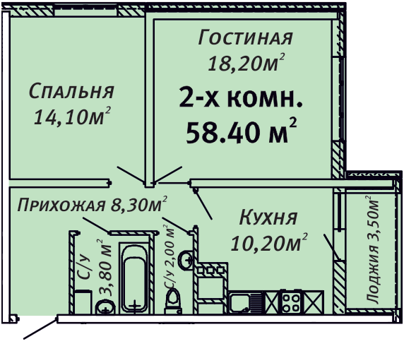 - двухкомнатные,общей площадью 57,2 м² — 70,2 м². Цена от 7200 грн/кв.м